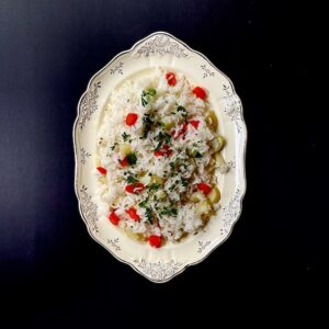 Herbed rice with Carrot and Potato was inspired by a Central Asian rice dish called Mashkichiri. Readers fluent in Hindi, Farsi, Uzbek, or Uiger may recognize the words mash–meaning mung bean, and kitchri, meaning a rice dish prepared with additional ingredients. My information comes from Jeffrey Alford and Naomi Duigud’s…